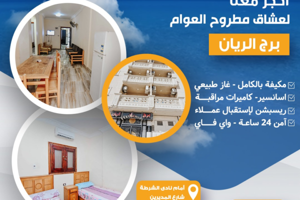 احجز معنا مصيفك برج الريان مطروح الاقامه 7 ايام 6 ليالى بالانتقالات للشقه 4 كراسي بالباص برج الريان العوام – الليدو قريب جدا من الكورنيش شقق مكيفة سوبر لوكس- البرج مزود بأسانسير البرج أمام نادى الشرطة الشقه غرفتين و صاله ( مكيفه ) – البرج محاطة به كل الخدمات – سوبر ماركت – أسواق –…